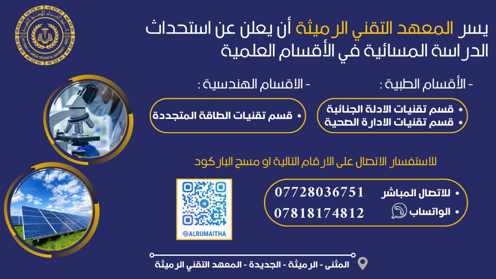 📢 إعــــلان هــام إلى طلبتنا الأعزاء المتقدمين إلى الدراسة المسائية في أقسام المعهد التقني / الرميثةيُعلن المعهد عن قوائم أسماء الطلبة المرشحين للقبول في الأقسام العلمية التال...