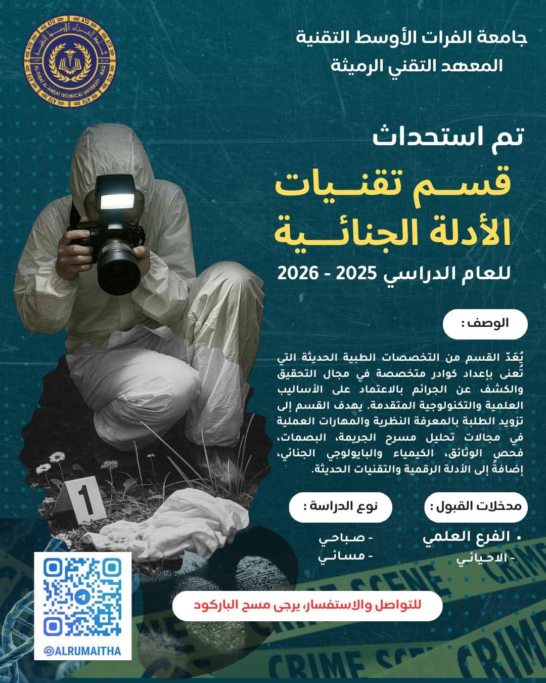 استحداث قسم تقنيات الأدلة الجنائية يعلن المعهد التقني الرميثة – أحد تشكيلات جامعة الفرات الأوسط التقنية عن استحداث قسم تقنيات الأدلة الجنائية للعام الدراسي (2025 – 2026)🎯 يهدف القسم إلى إعداد...