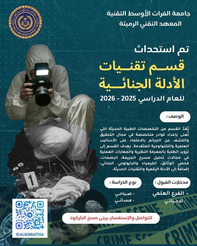 يعلن المعهد التقني الرميثة – أحد تشكيلات جامعة الفرات الأوسط التقنية عن استحداث قسم تقنيات الأدلة الجنائية للعام الدراسي (2025 – 2026)
